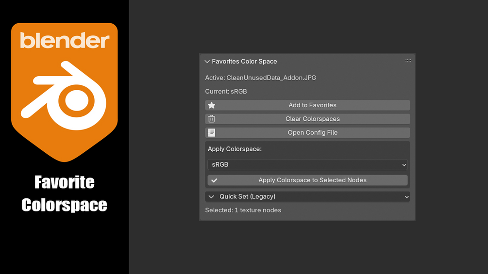 This Blender add-on allows users to manage their favorite color spaces for image textures in the Node Editor. It provides a quick way to save, select, and apply frequently used color spaces without manually navigating through long lists.