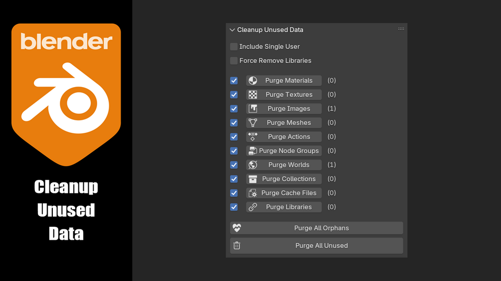 The Data Cleanup Tools addon provides an efficient way to remove unused data from your Blender projects, helping to optimize file size and improve performance. It allows users to purge various types of unused data, including: